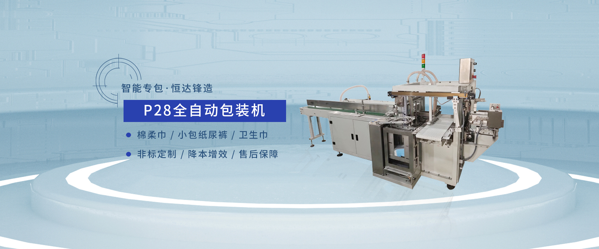 P28包裝機(jī)是主要用于衛(wèi)生巾、嬰兒紙尿褲(小包)、嬰兒護(hù)理墊、棉柔巾等裝袋封口的全自動(dòng)包裝機(jī)。